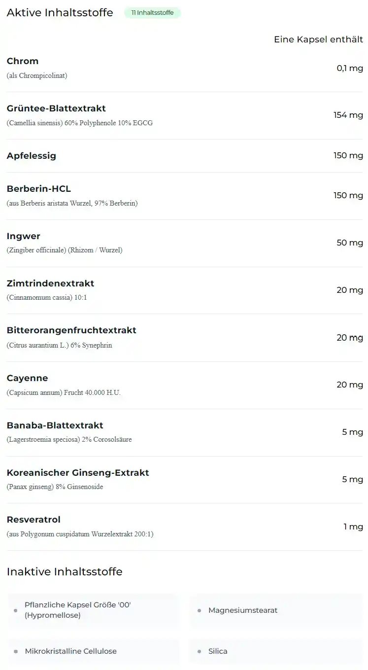 Slimivex ingredienser omfattar bland annat krom, grönt te-extrakt, cayennepeppar och berberin. Formulan är vegansk, glutenfri och GMO-fri för en medveten livsstil.